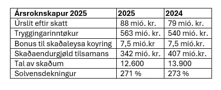 - Tilsamans fingu kundarnir hjá Betri Trygging 342 milliónir kr. í endurgjaldi fyri skaðar í 2025. Eingin stórur stormur var í fjør, og tað ávirkar bæði talið á skaðum, samlaða endurgjaldið og endaliga úrslitið, sigur Ingunn Eiriksdóttir, forstjóri í Betri Trygging